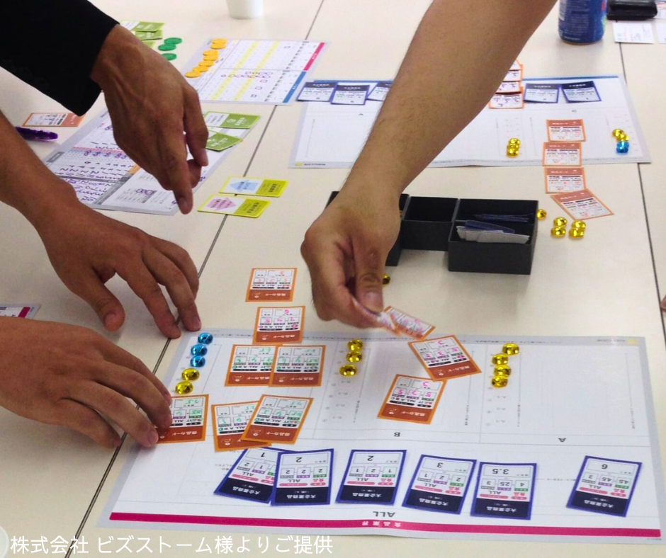 ―短時間で経営視点とビジネス共通言語を体感 ビズストームは、一人一社を経営するボードゲームを通じ、市場の動きや競合との関係を学びながら利益を生む仕組みを体感するビジネスシミュレーション研修です。